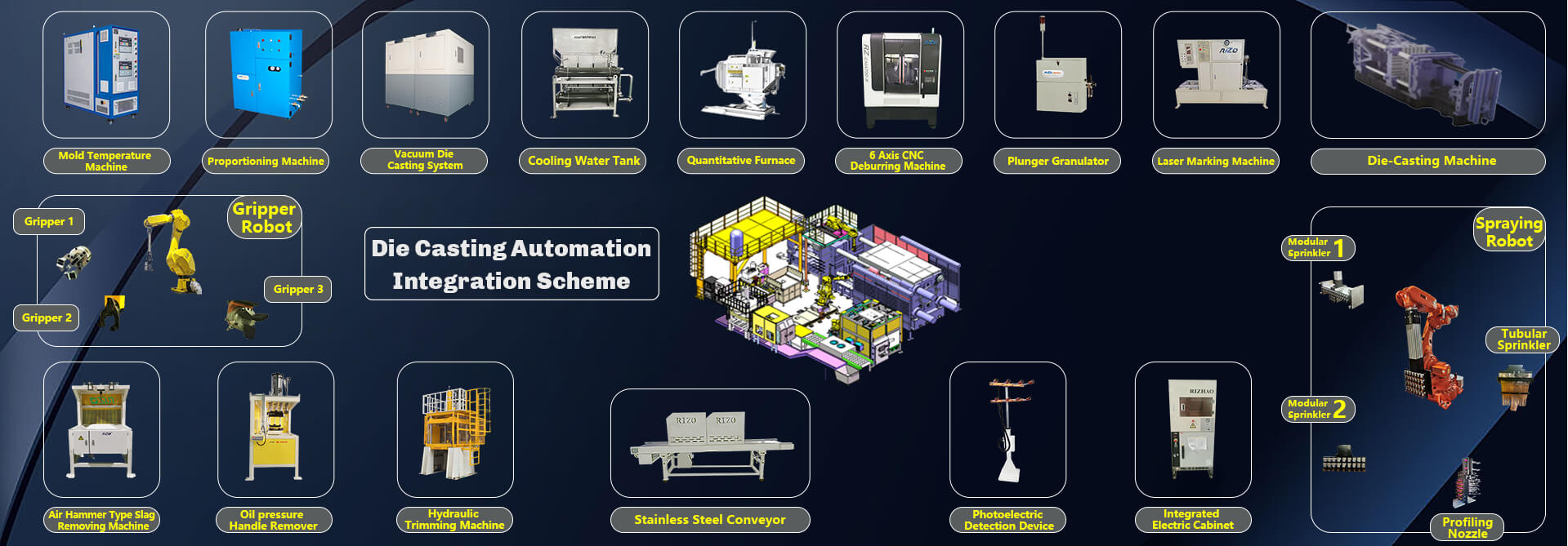 Shenzhen DayZhao Automation Equipment Co.,Ltd. (abbreviated as: Rizhao Intelligent) is a die-casting automation equipment, industrial robot, and intelligent production line solution provider integrating R&D, production, sales and service. The wholly-owned subsidiaries of Rizhao Intelligent include Shenzhen Rizhao Automation Equipment Co., Ltd., Rizhao (Shenzhen) Robot Technology Co., Ltd., and Shenzhen Rizhao Intelligent Technology Co., Ltd. The three are Die Casting Automation Division, Robot Division, The parent body of the Intelligent Manufacturing Division. At the same time, the company established Shenzhen Die-casting Intelligent Equipment Training College to provide practical and compound talent training services for the field of die-casting automation. As a die-casting intelligent equipment solution provider, Rizhao Intelligent is based on the principle of "solving customer needs and creating value for customers. With the spirit of tireless craftsmanship, it constantly develops new technologies, new processes and new applications in the field of industrial robots; strives for excellence Attitude, strictly control product quality, and provide customers with valuable, easy-to-use and practical intelligent equipment products and solutions. |